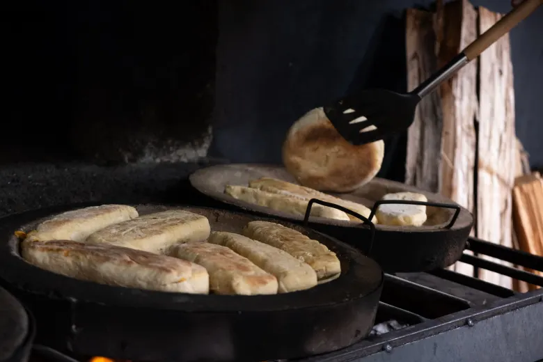 The dough is shaped into discs and cooked on a flat caco or stone slab. Once baked, it’s traditionally served hot with garlic butter, but it’s also delicious with cheese, ham, or fresh fillings.